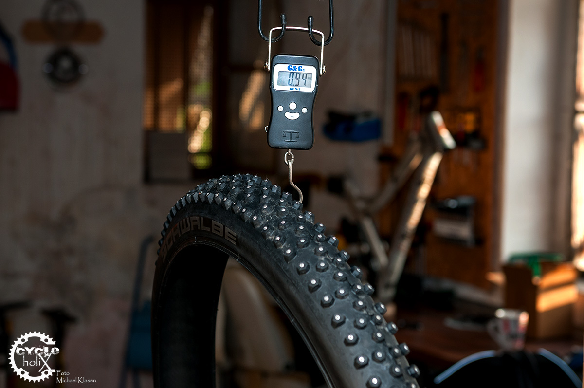 Laut Herstellerangabe wiegt der Evolution Reifen ca. 835gr, unsere Waage blieb bei 940gr stehen. Weitere 200gr kommen pro Laufrad für einen Schlauch hinzu (Schwalbe SV19 40/62-584-635).