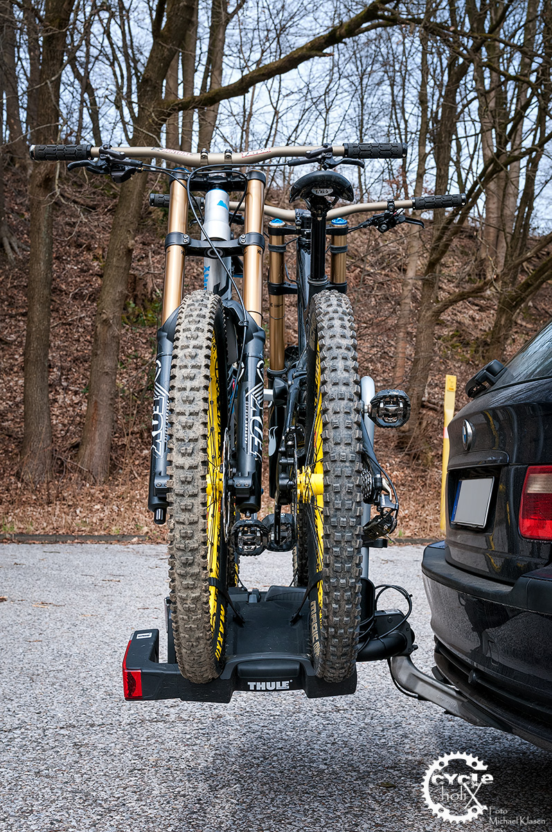 Mit einem Fahrradträger fährt man keine Rennen. Thule gibt eine max. Geschwindigkeit von 130km/h an. Auf Autobahnen blieb der Träger wie beschrieben unauffällig. Um zu testen, wie er bei Lastwechsel auf kurvigen Landstraßen reagiert, sind wir mit einer Testbeladung (Canyon Torque und Banshee Rune V2) über einige Landstraßen im Bergischen Land gefahren. Wir waren zwar nicht auf Sekundenjagt, allerdings sind wir zügig die kurvigen Landstraßen entlang gefahren, so dass der Radträger den ein oder anderen Lastwechsel ertragen musste.