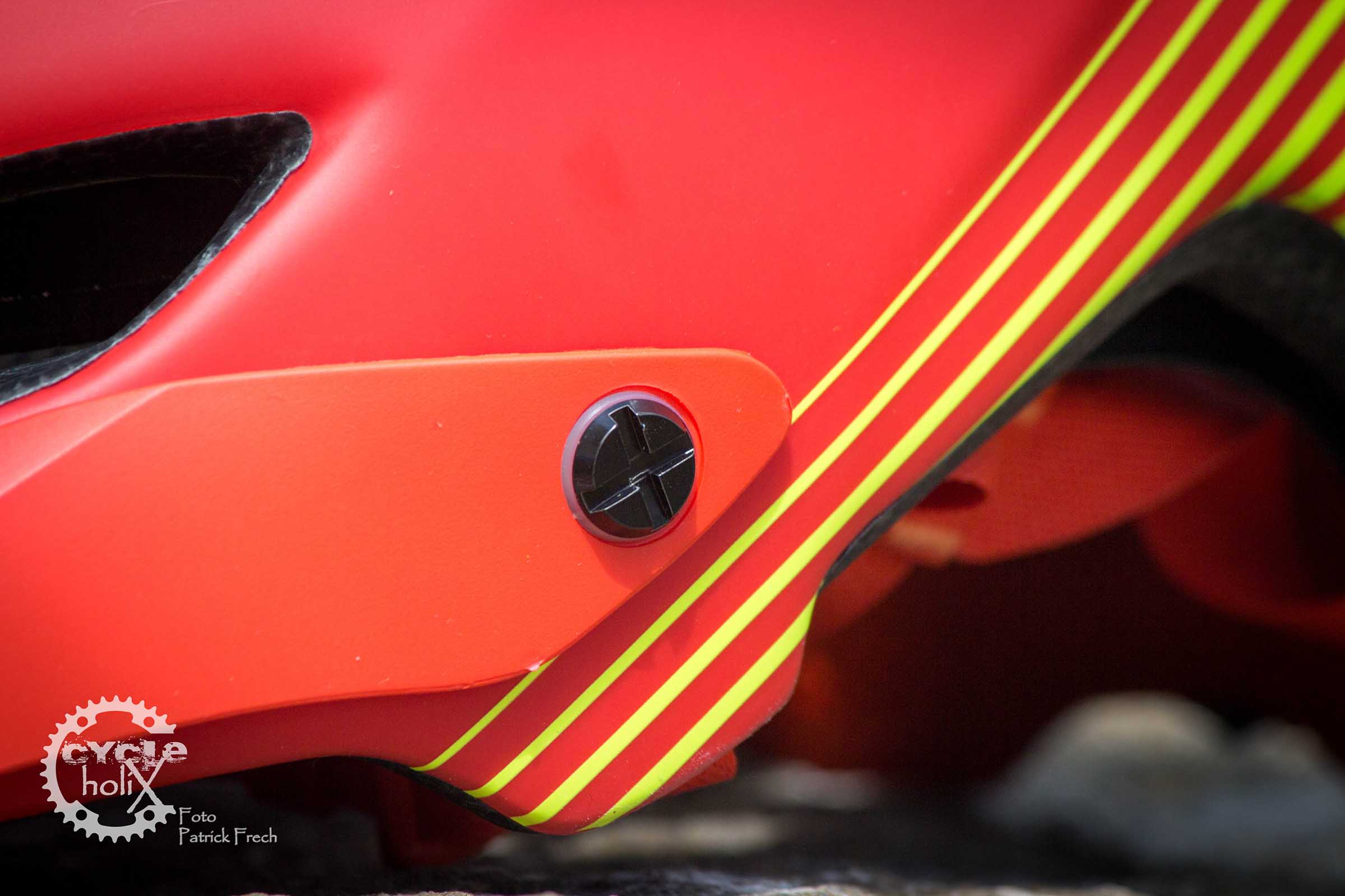 Der Feature ist in der IN-Mold Bauweise gefertigt, welche das gängige Verfahren bei den meisten Trail und Enduro Helmen ist. Die Passform ist ok, aber nicht so gut wie bei dem von uns getesteten Trail RS von IXS. Beim Feature vermissen wir etwas das umschließende Sicherheitsgefühl, welches andere Helme uns bereits geboten haben. Das ist natürlich rein subjektiv und kann bei anderen Fahrern bzw. Köpfen völlig anders ausfallen. Das „IN-Form“ System des Feature, welches den Helm zuverlässig am Kopf halten soll, funktioniert tadellos, ist aber von der Verstellung her als etwas fummelig zu bezeichnen. Die Höhe lässt sich in 7 Stufen verstellen, die Weitenverstellung erfolgt stufenlos. Der Versteller für den Kopfumfang lässt sich nur von einer Seite bedienen und muss zum Lösen eingedrückt werden. Schön wäre es hier gewesen, wenn man den Versteller von beiden Seiten bedienen bzw. greifen kann. Hat man den Feature auf seine Kopfform eingestellt sitzt der Helm bombenfest und verrutscht keinen Millimeter. Druckstellen konnten wir über den gesamten Testverlauf nicht ausmachen und die Polster im Helm sind ausreichend vorhanden und vernünftig verteilt. Etwas negativ finden wir, dass sich das hintere Polster nicht vom Helm entfernen lässt, da es verklebt ist. Für die Reinigung muss man sich hier also etwas anderes einfallen lassen.