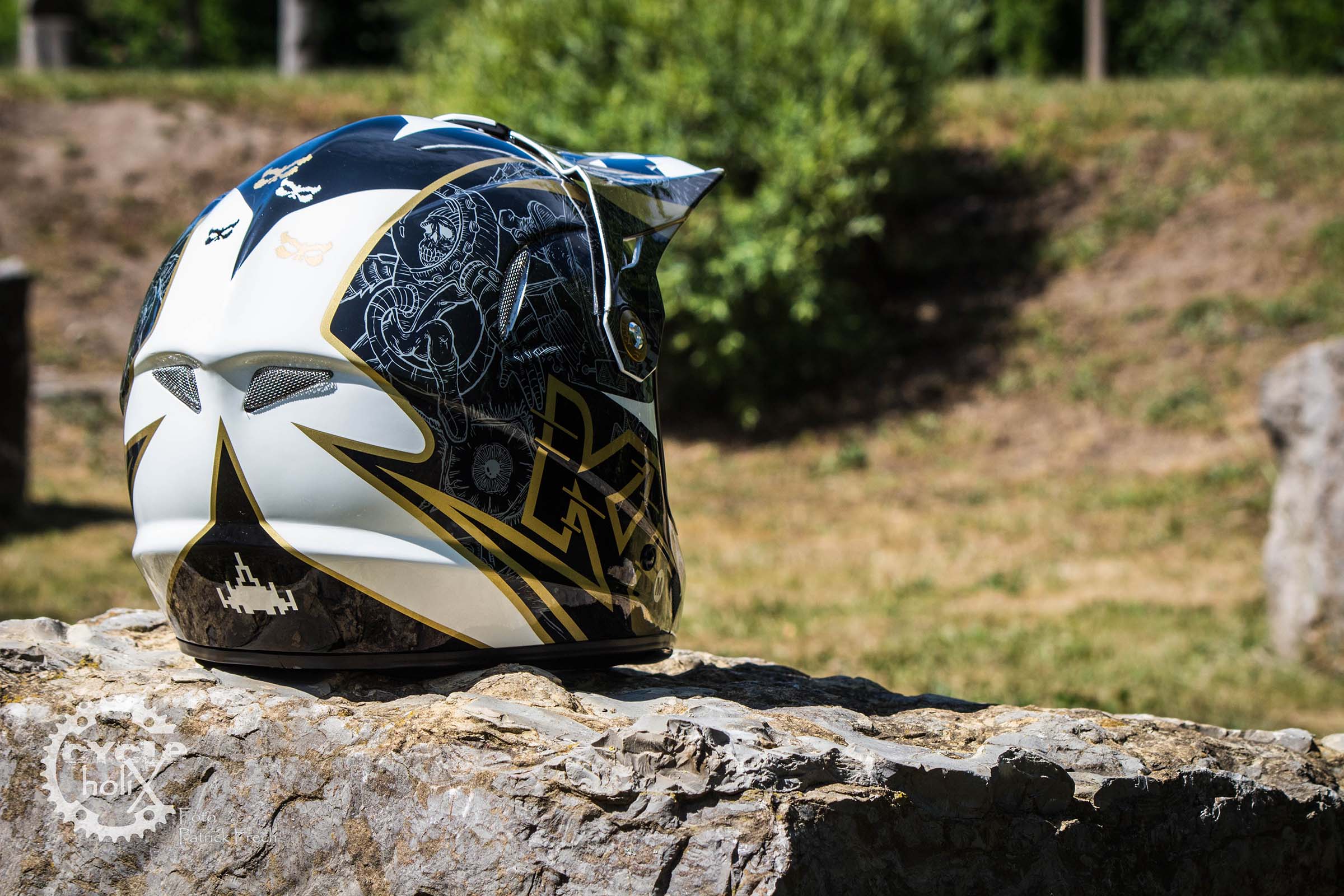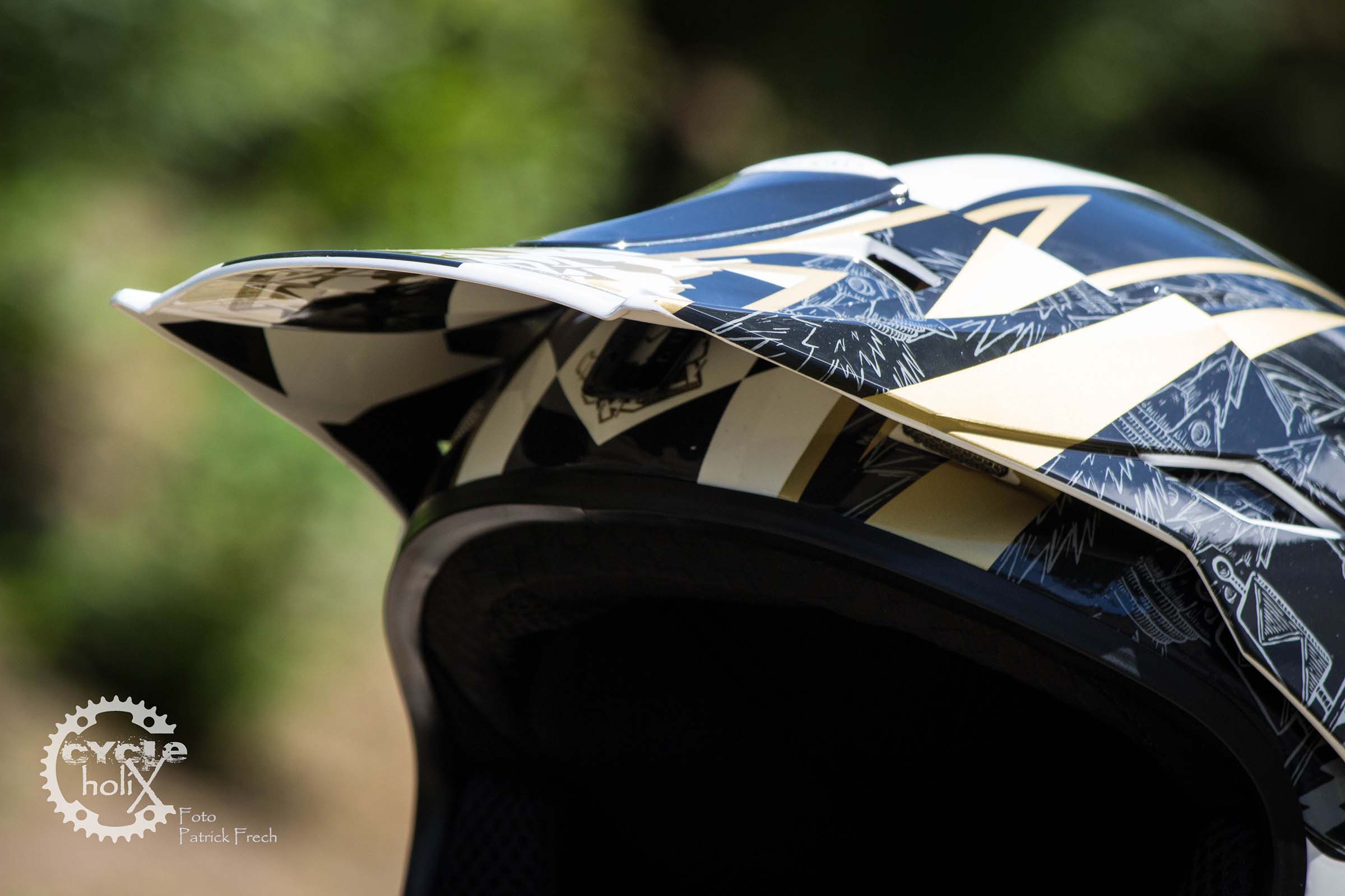 Optisch ist der Avatar X aber dann wieder das krasse Gegenteil zum dezent auftretenden Maya Helm. Kali kombiniert Schwarz, Gold und Weiß mit einem an Detail strotzendem Dekor zu einem gelungenen Design. Auf der Rückseite des Avatar X gibt es sogar eine kleine Hommage an das gute, alte Space Invaders. Das ist so ein Helm, den man sich auch wunderbar auf den Schreibtisch als Deko stellen kann.