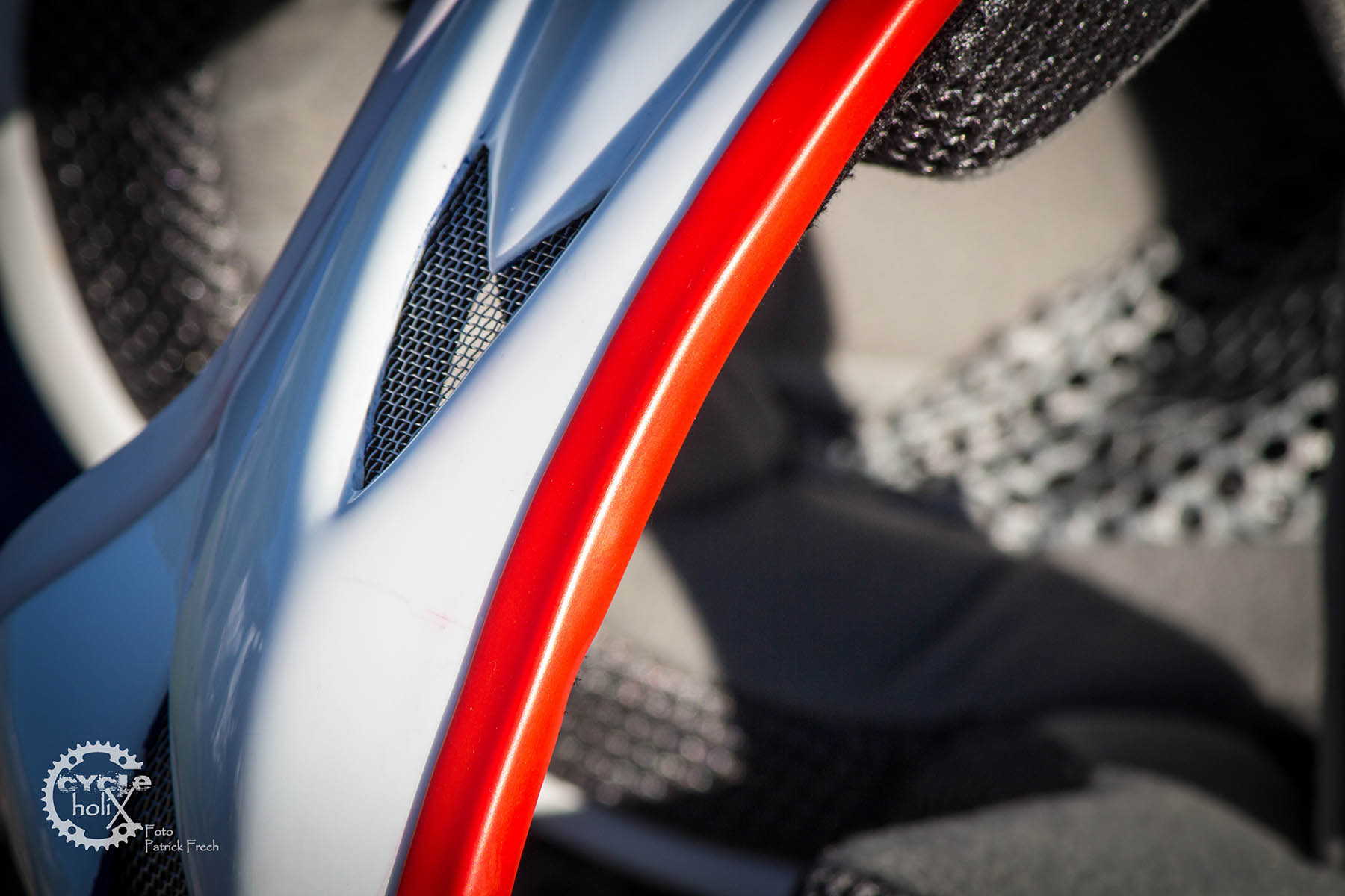 Ein Mix aus Carbon und Fieberglas bildet die Außenschale des 661 Rage, die bei unserem Testmuster zusätzlich aufwendig lackiert wurde. Sie schmiegt sich um den üblichen Kern aus EPS Schaum, sodass der Kopf des Fahrers im Fall eines Sturzes geschützt ist. Der erste Eindruck des 661 Rage in der Variante Navy/White/Red ist sehr gut. Die Verarbeitung wirkt hochwertig und wie von anderen 661 Produkten gewohnt durchdacht. Ein kleines Manko stellt das rote Gummi am unteren Rand des Helms dar, welches zu Beginn des Tests abfärbte und weniger schöne Spuren an den Trikots hinterließ. Im weiteren Verlauf erledigte sich dieser „Farbüberschuss“ von selbst.