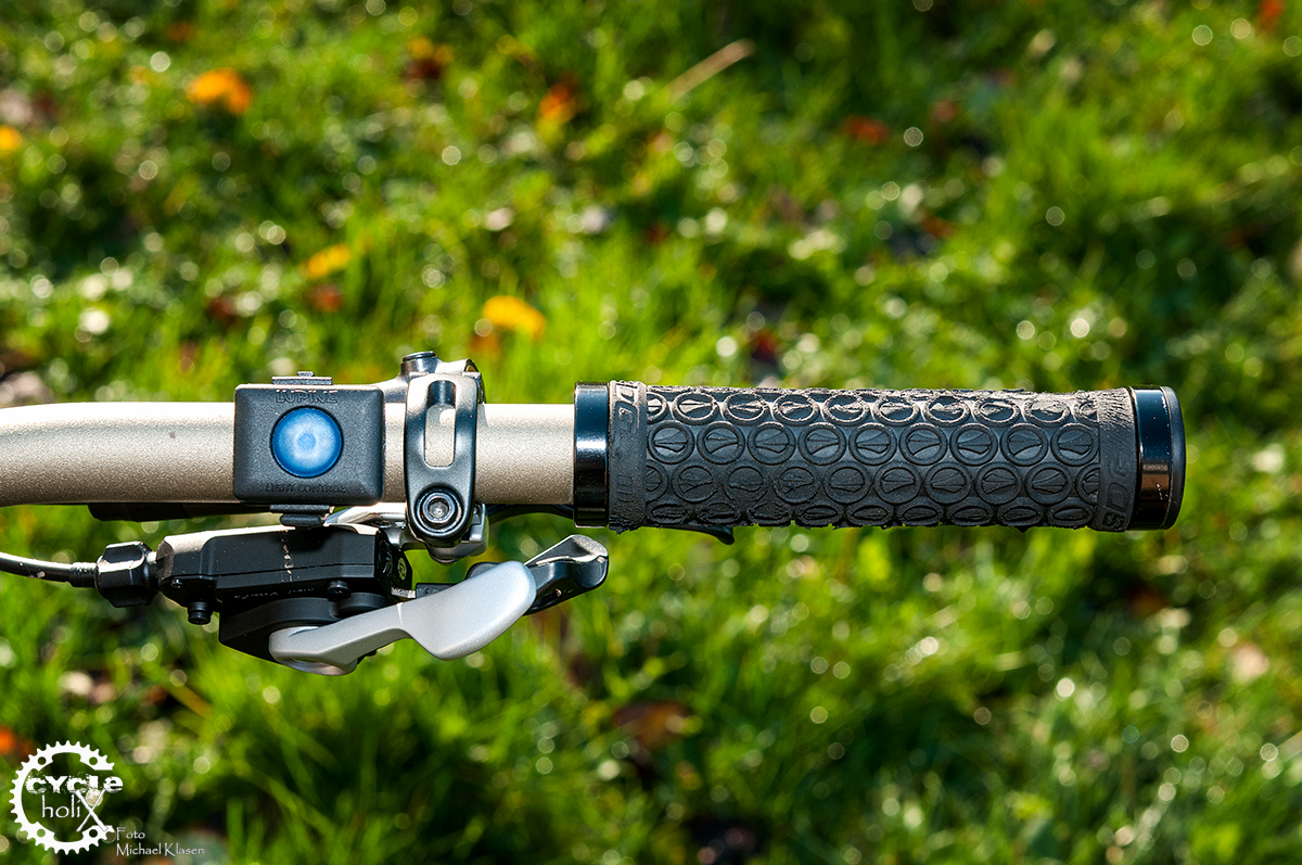 Bei der Erstmontage hat Michael die Fernbedienung direkt neben dem Lenkergriff montiert. Im Gefecht erwies sich diese Position als suboptimal, da Michael häufig unbeabsichtigt die Leuchtkraft veränderte. Als optimal hat sich die Montage mit Abstand einer Daumenspanne erwiesen. Die Fernbedienung ist noch komfortabel vom Griff aus erreichbar, wird aber nicht unbeabsichtigt betätigt.
