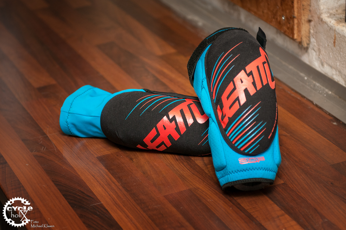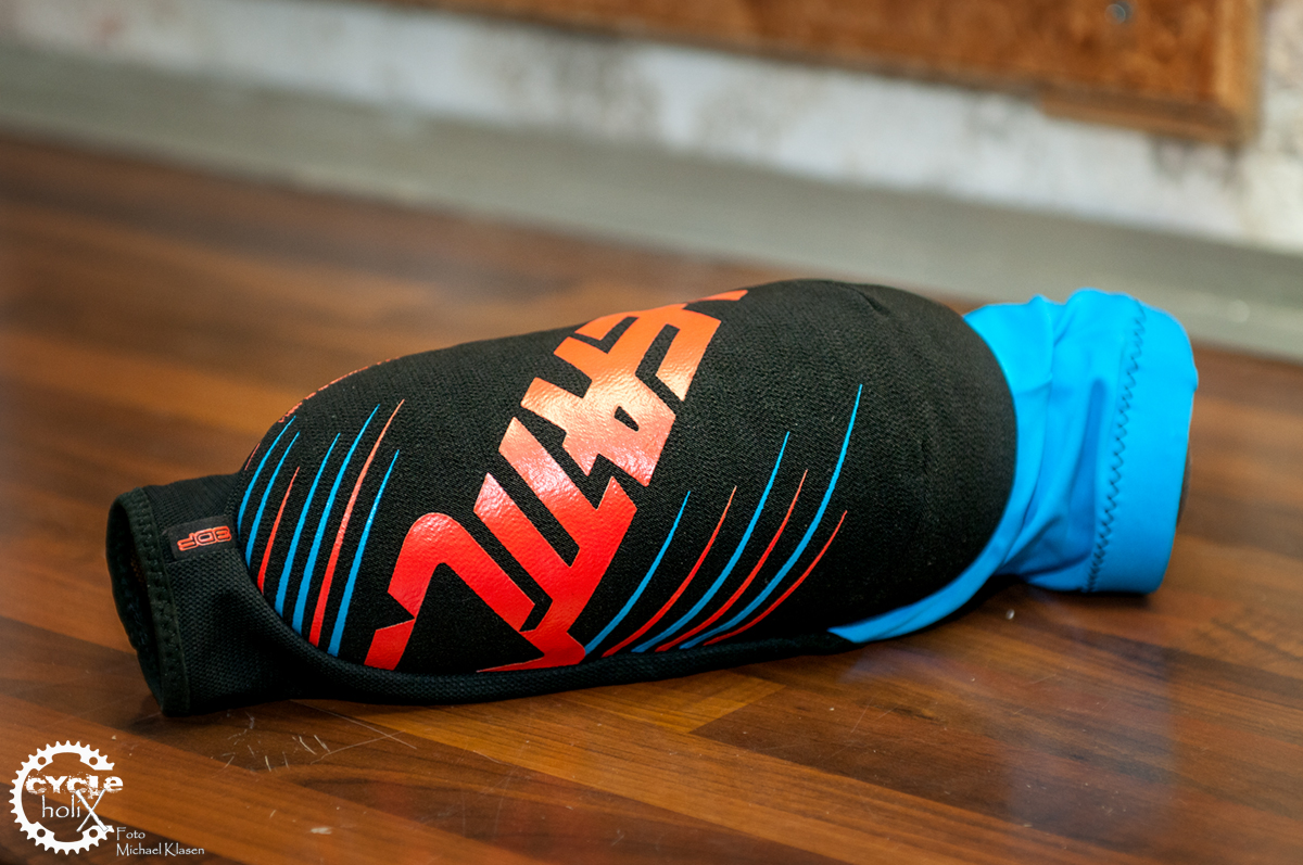 Genau wie bei den Knieschonern ist das 3DF Polster anatomisch geformt und die passende Seite auf der Rückseite vermerkt. Die Ellbogenschoner werden wie ein Strumpf getragen, sprich ohne Klettverschluss. Ein Silikondruck für den Ellbogen auf der Innenseite soll das Verrutschen verhindern.