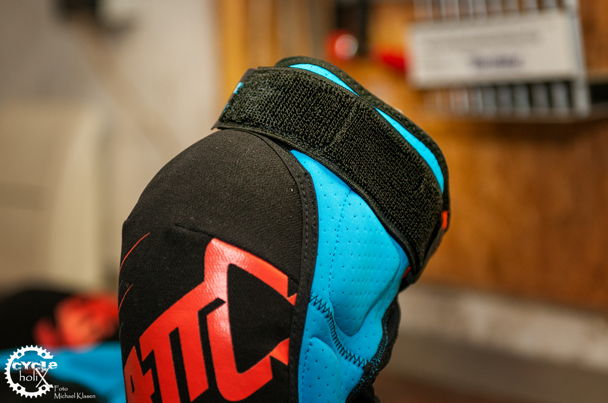 Gegen Verrutschen sorgen ein Silikonband und nur ein Klettverschluss auf dem Oberschenkel. Ein tolles Detail ist ein weiterer kleiner Klett. Auf diesem kann der Verschluss befestigt werden, wenn die Schoner nicht fest getragen werden müssen, wie z.B. bei einer Pause auf der Enduro Tour.