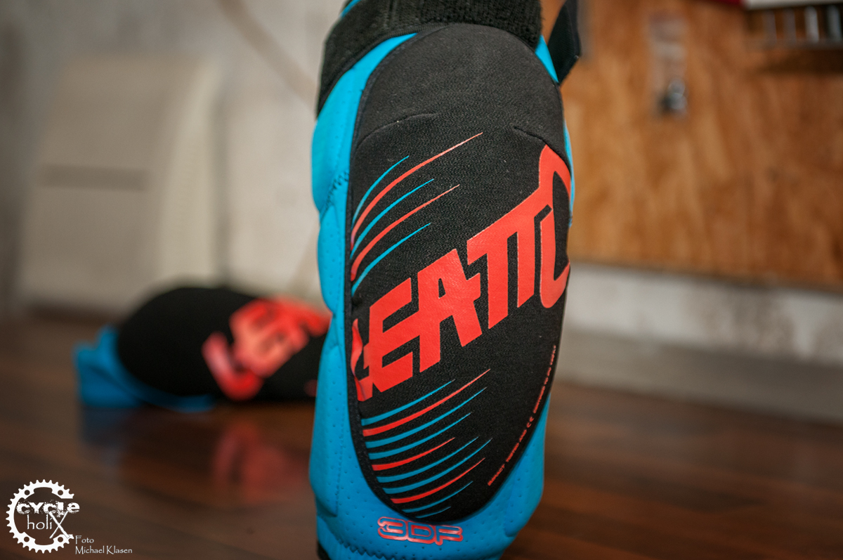 Kernstück der Schoner ist das große und anatomisch geformte 3DF Schaumpolster auf der Vorderseite. Anatomisch geformt bedeutet, dass die Schoner seitengebunden sind. Welcher Schoner an welches Bein gehört, ist über einem Aufdruck auf dem luftigen Meshgewebe auf der Rückseite vermerkt. Ein großer Ausschnitt mittig auf der Rückseite verhindert kneifende Stelen in der Kniekehle. Für den seitlichen Aufschlagschutz hat Leatt kleine Polster an der Seite des Schoners angebracht.